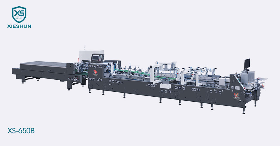 Pemasok XIESHUN XS-650B Crash Lock Mesin Gluer Kecepatan Tinggi Otomatis Cocok untuk kotak kunci tabrakan ukuran kecil dan kotak garis lurus dalam kecepatan tinggi dan produksi yang efisien, berlaku di industri farmasi atau kosmetik. Karton 200-800 gsm dan seruling kotak bergelombang N/E dan seruling F.